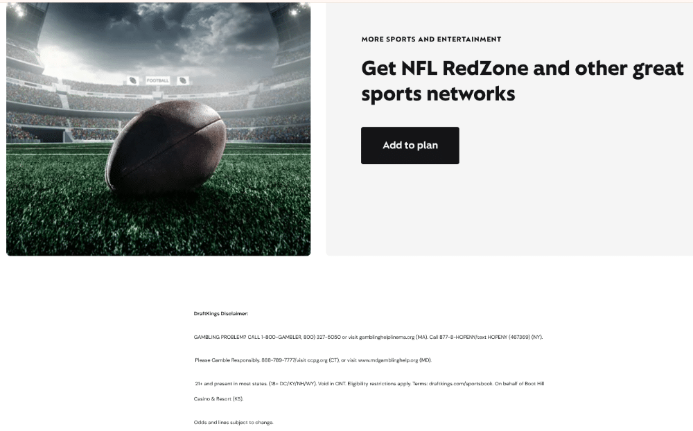The package page mentions the crossover with Xfinity Odds Zone, enabling “live odds and props from the top sportsbooks… Just say, ‘View Odds’ into your Voice Remote.” No mention whatsoever about gambling addiction, gaming addiction, or reduced cost packages for people on fixed incomes.